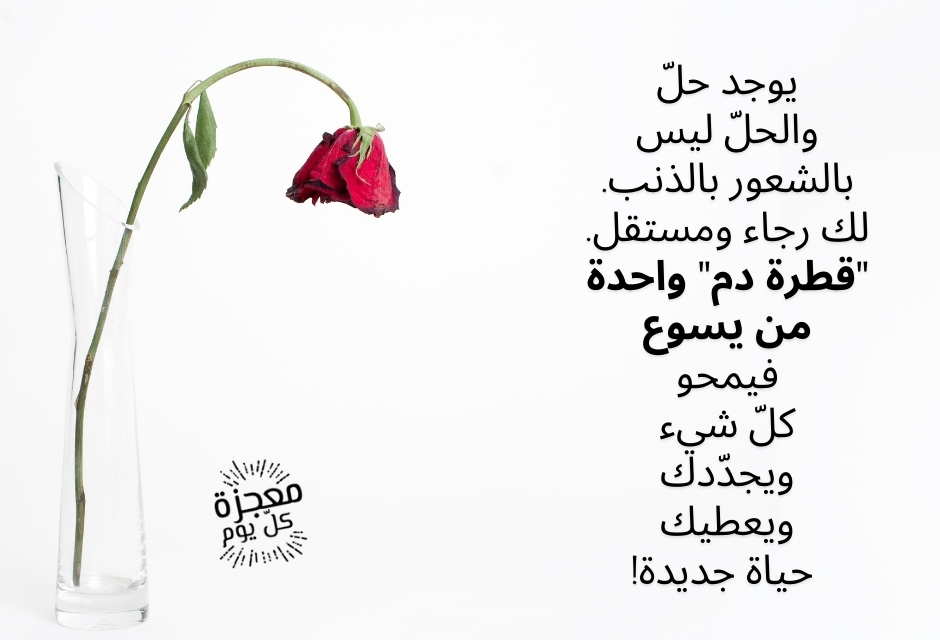 ولكن يوجد أخبار سارة يا صديقي، لست مضطرًا أن تبقى في حالة ذبول! يوجد حلّ والحلّ ليس بالشعور بالذنب. لك رجاء ومستقل. "قطرة دم" واحدة من يسوع فيمحو كلّ شيء ويجدّدك ويعطيك حياة جديدة!